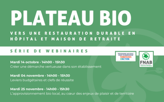 Dans le cadre du projet Plateau Bio, porté par la FNAB grâce au soutien du Programme national de l’alimentation, le réseau des agriculteurs biologiques propose une série de trois webinaires sur la transformation alimentaire des restaurants collectifs des hôpitaux, cliniques et maisons de retraite.
